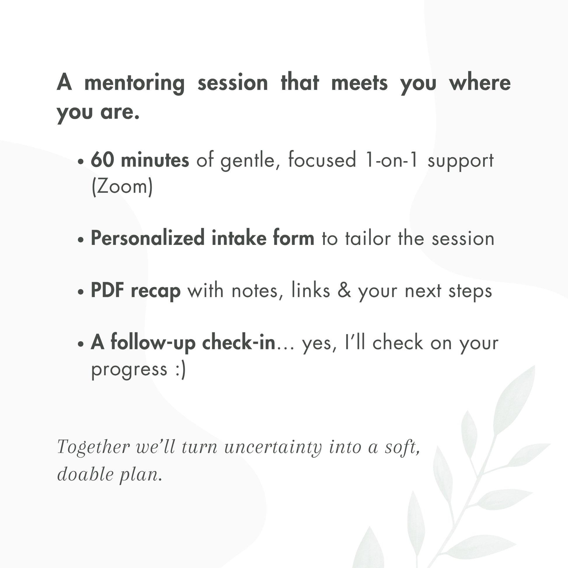 This 1-on-1 session is a calm and intentional space where you can exhale, ask the questions you’ve been holding onto and receive guidance that meets you exactly where you are, without pressure or hustle.