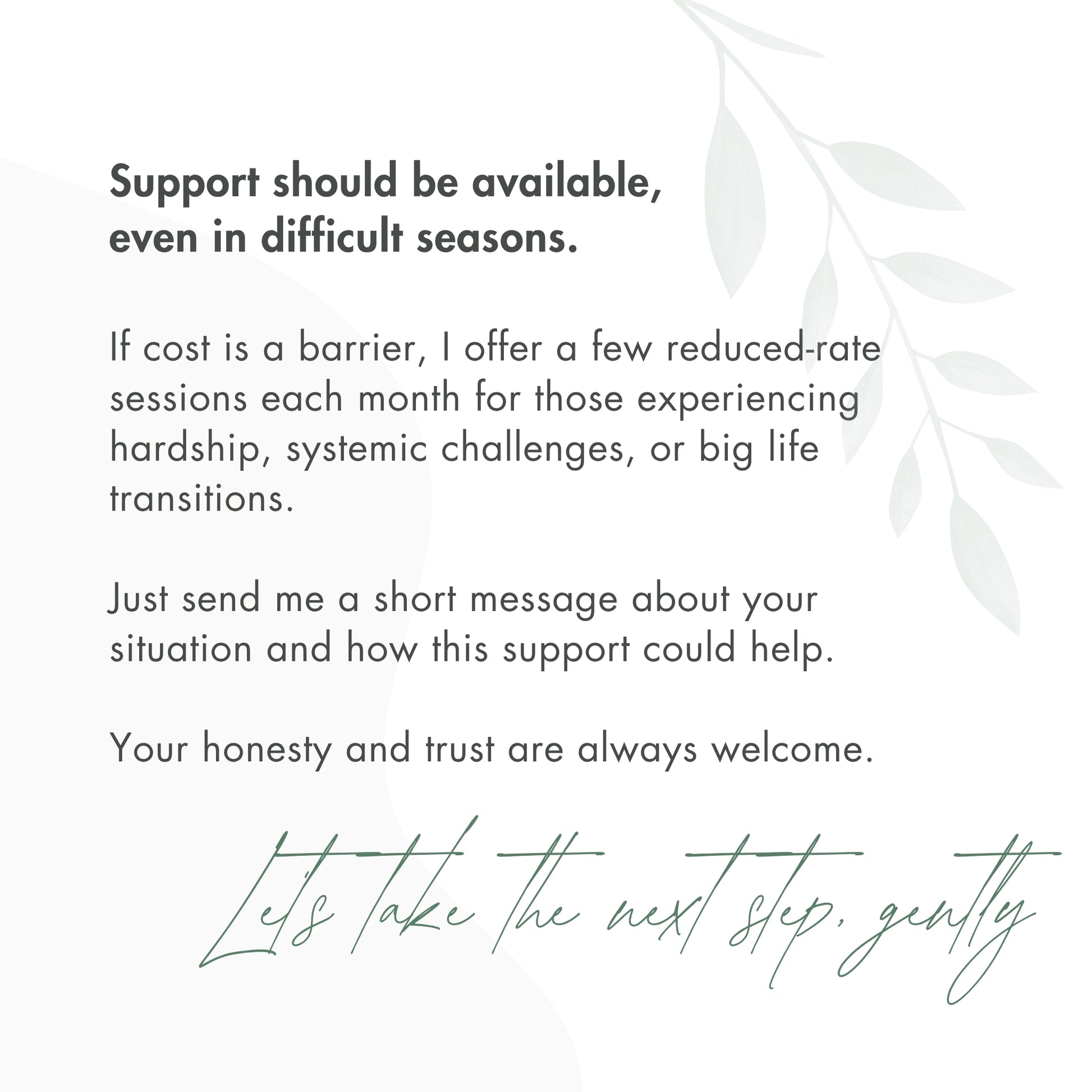 If the full price is out of reach for you right now, I offer a few reduced-rate sessions each month for those navigating hardship, systemic barriers, caregiving or big life transitions.