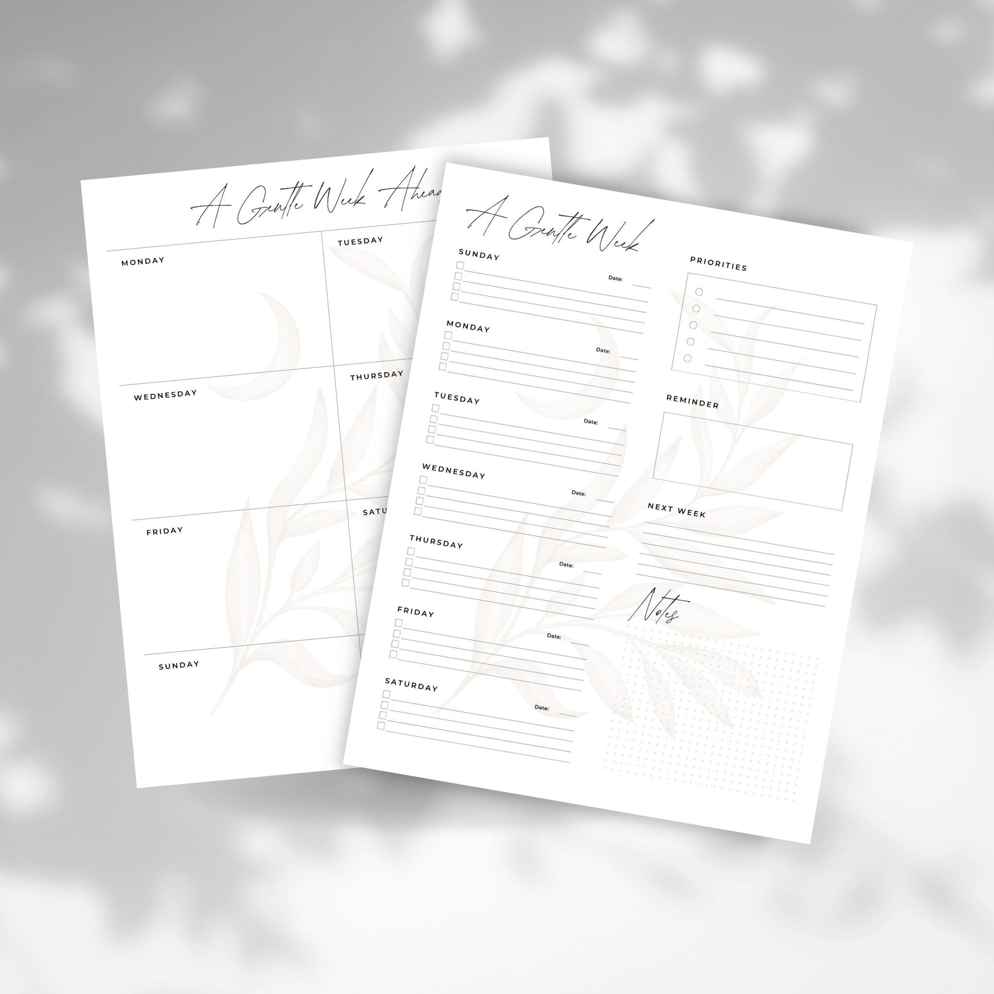 - A Gentle Week Ahead — soft weekly layout to track priorities and reminders (2 options)